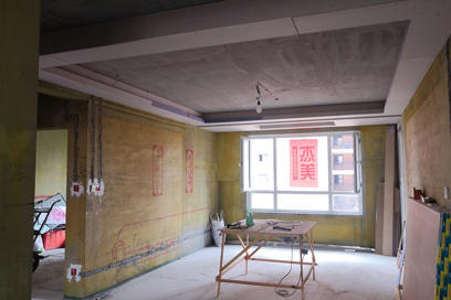 木工正在進行,石膏線和木質(zhì)輕鋼龍骨搭配,打造質(zhì)量為王的吊頂